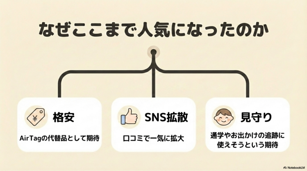 価格の安さと手軽さから、Appleの「AirTag」など数千円以上するブランド品の”格安代替品”として注目を浴びました。