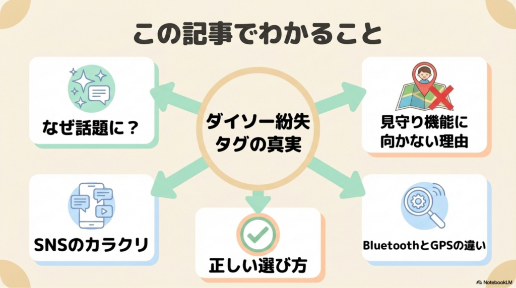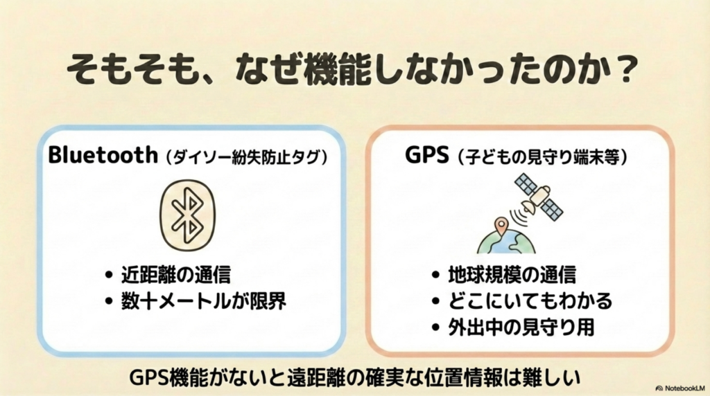 これはダイソータグの本来の使い方の範囲内ではありますが、「外出先でも追跡できる」という誤解につながった可能性があります。