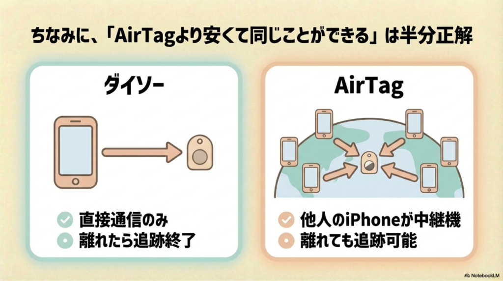 ただし「AirTagと同じことが安くできる」かというと、それは正確ではありません。