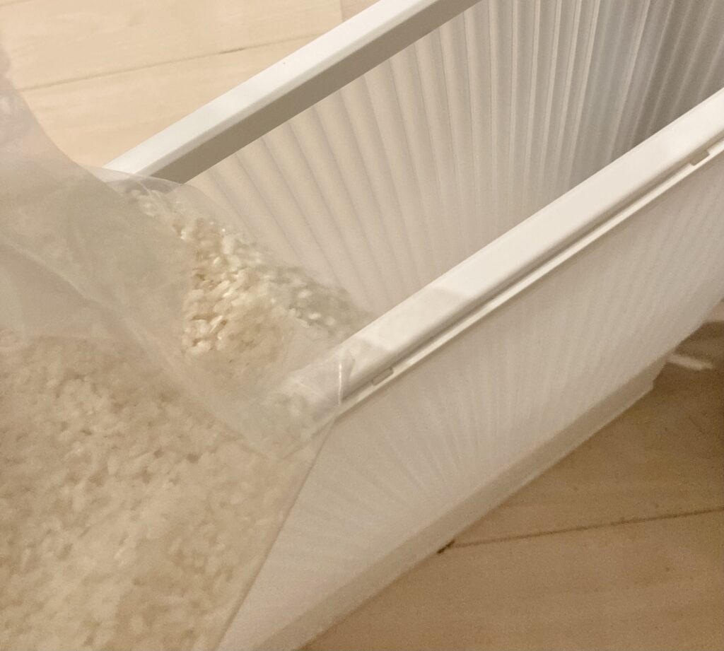 米を入れるときは袋の端を少しだけ切ってゆっくり入れます。